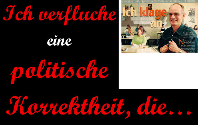 Ich verfluche eine politische Korrektheit, die das nicht sieht! Ich verfluche eine politische Korrektheit, die das nicht klar benennt! Ich verfluche eine politische Korrektheit, die das entschlossene Handeln verhindert! Ich verfluche eine politische Korrektheit, die Lehrer und Schüler in Angst, Bedrohung und Verzweiflung allein lässt! Ich verfluche eine politische Korrektheit, die sich in ihrem politisch korrekten Gewissen suhlt auf Kosten verängstigter, bedrohter und verzweifelter Schüler und ihrer Lehrer! Fluch den ideologisch Blinden, Fluch den politisch Feigen und Fluch den wortreich Empörten und stets Tatenarmen!